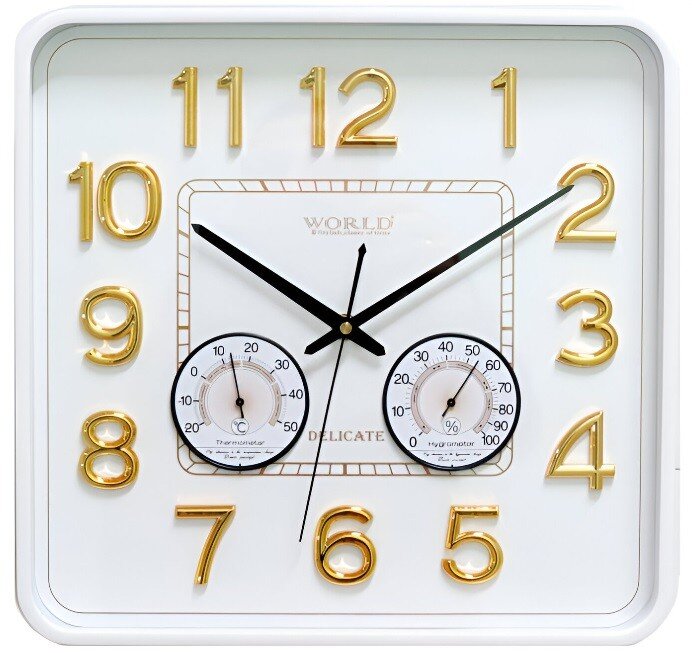 «7778k WC (в уп10шт.) - Часы настенные WORLD. Корпус выполнен из пластика. Циферблат закрыт стеклом. Механизм кварцевый плавного хода. Питание от батарейки АА (в комплект не входит). Особенность: светящиеся цифры, датчики температуры и влажности. Размер модели: 325*335*45 мм.»